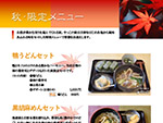 鴨とキノコの豊かな味「鴨うどん」(セット / 単品)や、黒胡麻と吉野本葛を練りこんだのど越しの良い「黒胡麻めん」(セット / 単品)など、秋の味覚をご堪能ください。 |