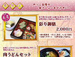 春メニュー登場しました。 桜のシーズンにさきがけ、お店のメニューに桜色の春メニューが登場しました。 彩りあでやかな「彩り御膳」をはじめ、新登場の「肉うどん」や、吉野本葛入りの「桜めん」など、春にふさわしいメニューをご用意し、皆さまのお越しをお待ちしています。 >>詳しく |